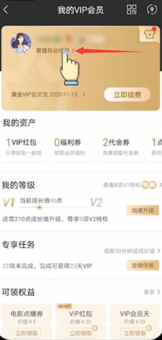 1、打开爱奇艺,进入“我的VIP会员”,此时,单击“管理自动续内费”按钮,对自动续费进行设置。