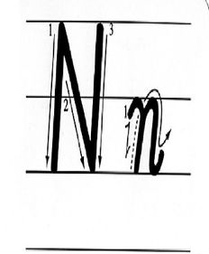 小写字母m:要充满中格,一笔写成,三小竖间都要均匀。