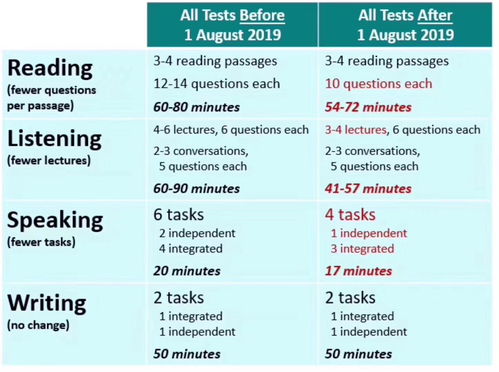 其中阅读文章(54-72分钟),听力(41-57分钟),口语(17分钟。