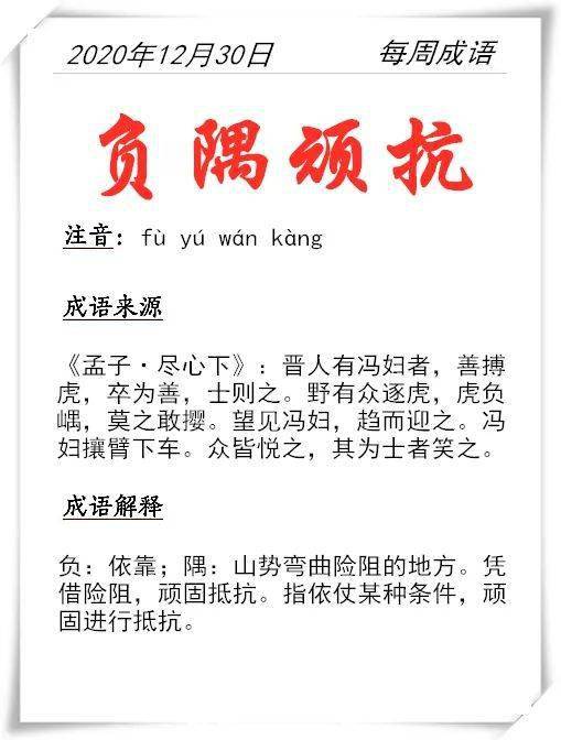 负隅顽抗的释义为:负:依靠;隅:山势弯曲险阻的地方。