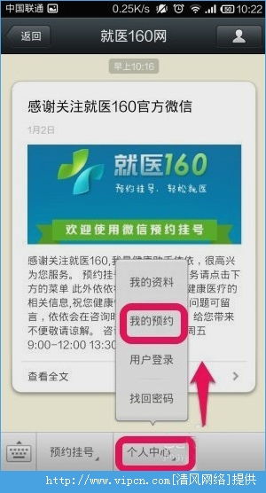 3、点击进入该公众号,选择右下角的“个人中心”,在弹出页面中点击挂号记录。