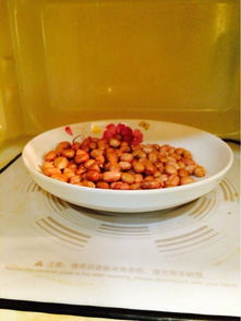 继续放入微波炉中追加“叮”30秒钟;将盘子取出,此时的花生米仍处于高温状态能听得到“吱吱”地响声,取一粒花生米尝尝,