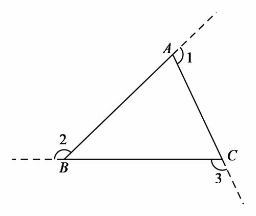 三角形外角和公式:在△ABC中,∠1+∠2+∠3=180°。