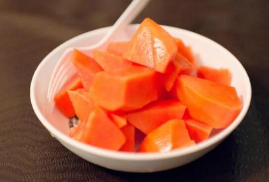 木瓜直接生吃步骤首先洗净,把它从中间切开,然后用干净的小勺挖掉它中间的黑色种子,再把得到的木瓜果肉切成块状,把它外层的黄色表皮也消掉,得到的木瓜果肉块直接摆放在盘子中,用牙签插着吃就可以。